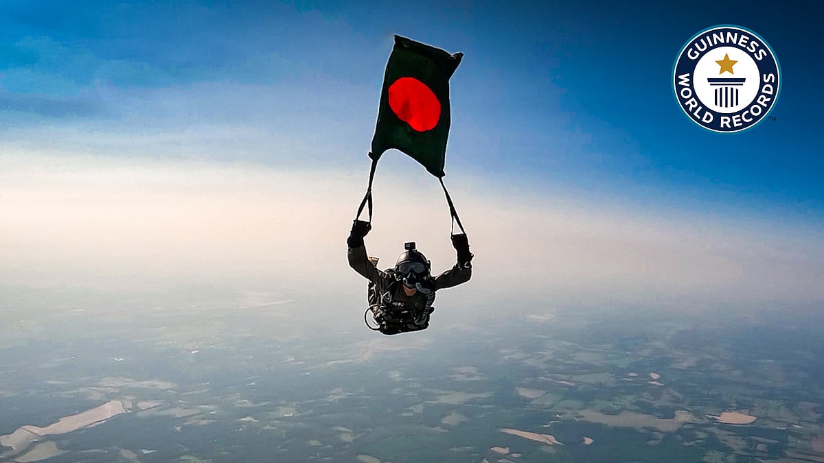 ৪২ হাজার ফুট উঁচু থেকে বাংলাদেশের পতাকা নিয়ে ঝাঁপ দেন স্কাইডাইভার আশিক চৌধুরী। এ ঘটনা জায়গা করে নিল গিনেস ওয়ার্ল্ড রেকর্ডসে। গিনেসের ‘গ্রেটেস্ট ডিসট্যান্স ফ্রিফল উইথ আ ব্যানার/ফ্ল্যাগ’ শাখায় রেকর্ডটি ছিল ভারতের স্কাইডাইভার জিতিন বিজয়ানার। সেই রেকর্ড ভাঙলেন আশিক। বিস্তারিত দেখুন ভিডিওতে