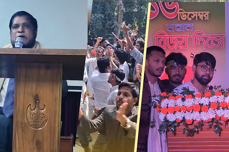 <p>মহান বিজয় দিবস উপলক্ষে চট্টগ্রাম বিশ্ববিদ্যালয়ে অনুষ্ঠান বর্জন করেছেন ছাত্রদল নেতা ও চাকসুর এজিএস আইয়ুবুর রহমান, হল সংসদের ৮ জন প্রতিনিধি ও এক হোস্টেল প্রতিনিধি। কেন তাঁরা অনুষ্ঠান বর্জন করলেন বিস্তারিত ভিডিও প্রতিবেদনে….</p>