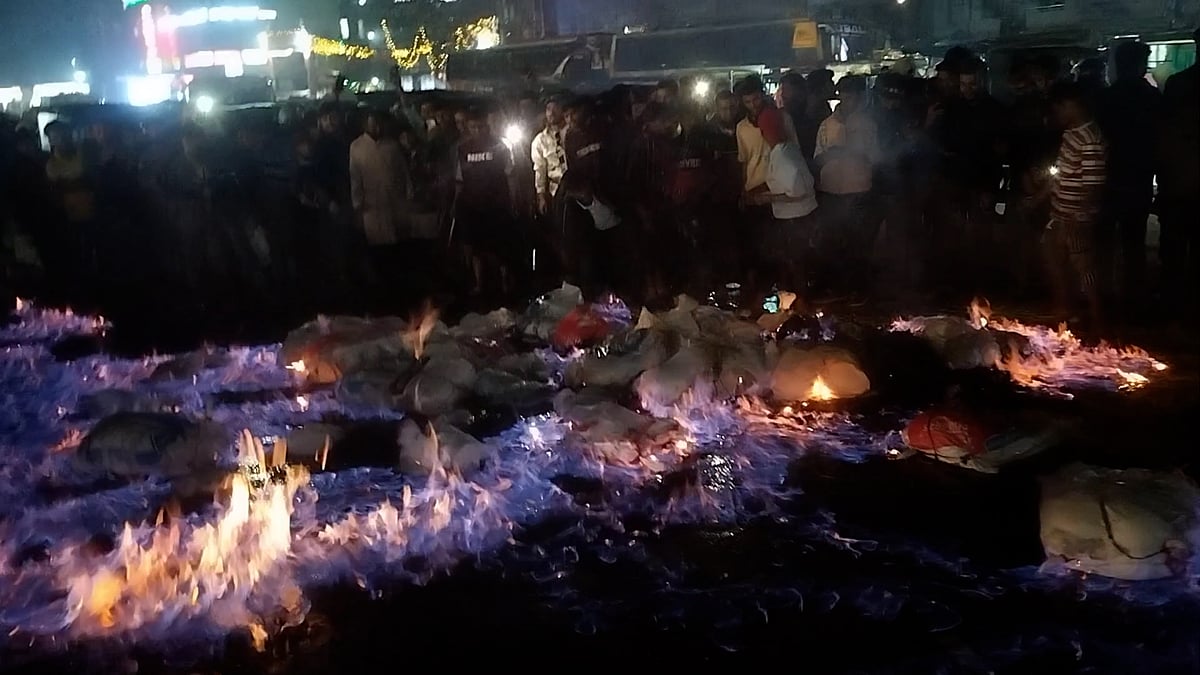 খড় সরাতেই বের হলো চোলাই মদের বস্তা, আগুন দিয়েছে জনতা