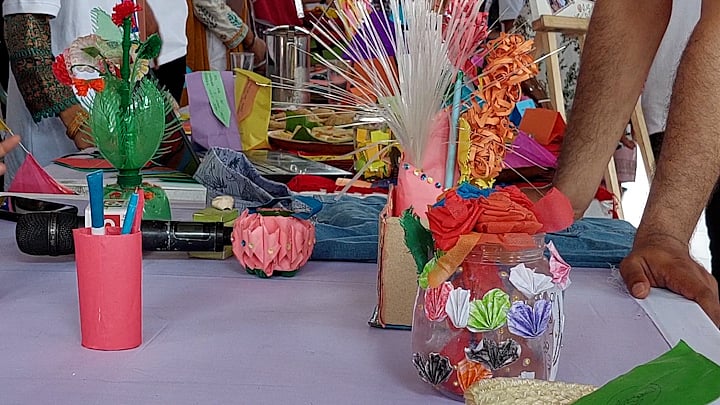 কাগজের কলম, জিন্সের প্যান্টের তৈরি বাজারের ব্যাগ, টিস্যুপেপারে তৈরি ফুলসহ নানা পণ্য তৈরি করছেন তরুণেরা। মূল উদ্দেশ্য, পরিবেশ রক্ষা