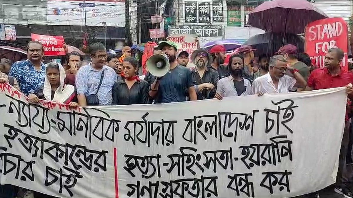 <p>বৃষ্টিতে ভিজে রাজধানীর ফার্মগেটে সমাবেশ করেছেন দৃশ্যমাধ্যমের শিল্পীরা। তবে পুলিশের বাধায় তাঁরা পূর্বঘোষিত মানিক মিয়া অ্যাভিনিউয়ে সমাবেশ করতে পারেননি। বিস্তারিত দেখুন ভিডিওতে...</p>