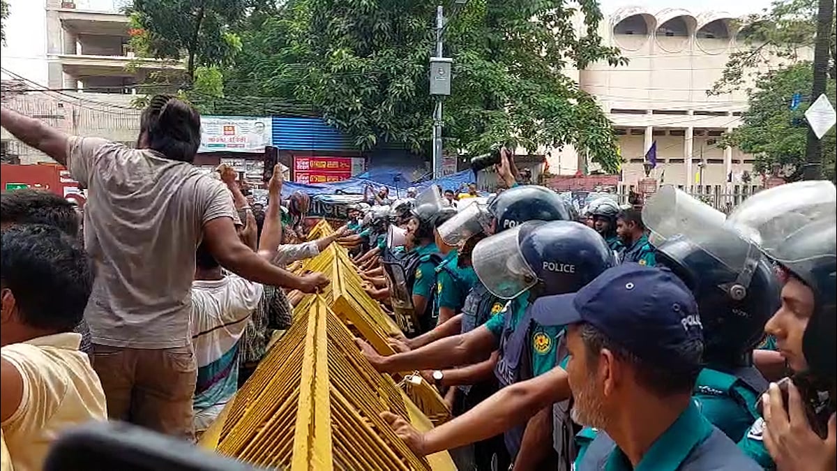 <p>চাকরিচ্যুত বিডিআর সদস্যদের যমুনার অভিমুখী ঘেরাও কর্মসূচিতে পুলিশের বাধা। এ ঘটনায় শাহবাগ মোড় অবরোধ করে রাখেন সাবেক বিডিআর সদস্যরা। বিস্তারিত দেখুন ভিডিও প্রতিবেদনে...</p>
