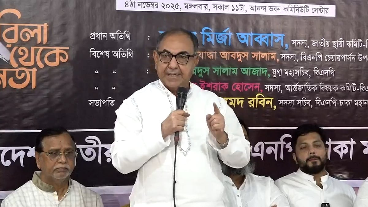 দুটি দল যা বলে, বর্তমান অন্তর্বর্তী সরকার তা-ই করছে বলে মন্তব্য করেছেন বিএনপির স্থায়ী কমিটির সদস্য মির্জা আব্বাস। ৪ নভেম্বর দুপুরে রাজধানীর নয়াপল্টনে ঢাকা সিটি করপোরেশনের সাবেক মেয়র সাদেক হোসেন খোকার ষষ্ঠ মৃত্যুবার্ষিকী উপলক্ষে অনুষ্ঠিত স্মরণসভায় তিনি এ কথা বলেন। বিস্তারিত ভিডিওতে...