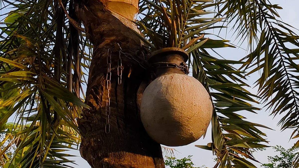 চুরি ঠেকাতে খেজুরের রসের হাঁড়িতে তালা দিয়ে রাখছেন গাছি হারুন অর রশিদ। বিস্তারিত ভিডিওতে