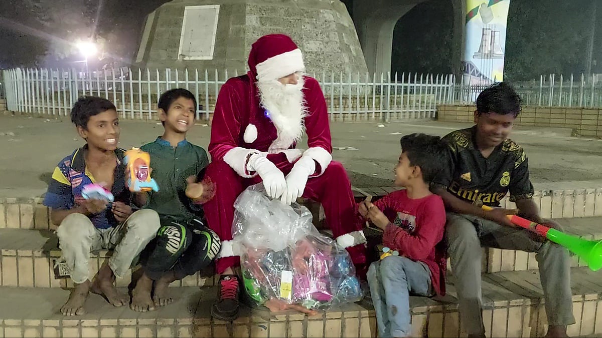 ফিলিস্তিনের পতাকা গায়ে ঢাকার রাস্তায় সান্তা ক্লজ
