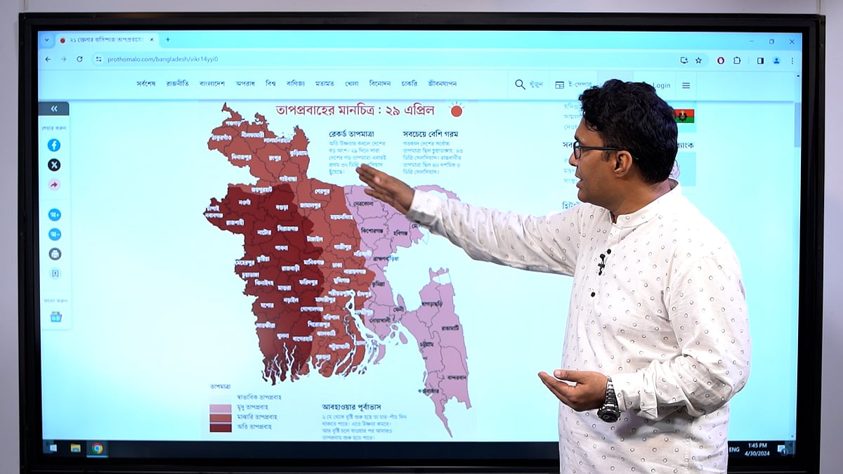 গত ২৯ দিনে সারা দেশের গড় তাপমাত্রা এই প্রথম প্রায় ৩৭ ডিগ্রি সেলসিয়াস ছুঁয়েছে। মানচিত্রে দেখা যায়, তাপপ্রবাহের কারণে সবচেয়ে ঝুঁকিতে আছে ২১ জেলা। এই ২১ জেলার অধিবাসীরা তাপপ্রবাহের উচ্চ ঝুঁকিতে রয়েছেন