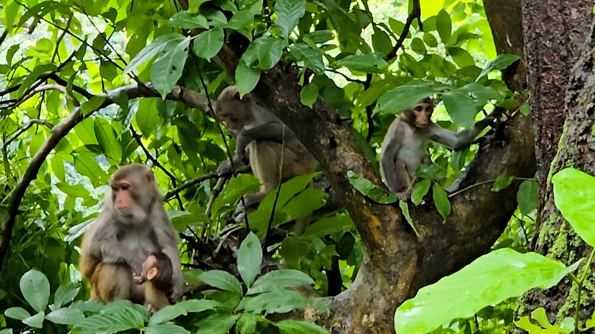 শালবনে বাচ্চাদের সঙ্গে মা বানরের দুষ্টুমির দৃশ্য