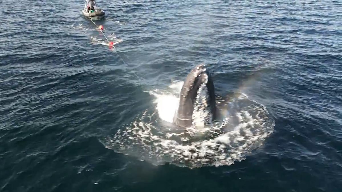 কানাডার ভ্যাঙ্কুভার উপকূলে দড়ি আর জালে আটকে যায় উইগিন্স নামের এক তিমি। প্রায় ৪৫০ ফুট লম্বা দড়ি ও মাছ ধরার সরঞ্জামে জড়িয়ে পড়েছিল এটি। দেখুন ভিডিওতে...