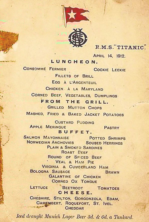 প্রথম শ্রেণির মেনুকার্ডের শিরোনাম ছিল ‘আরএমএস টাইটানিক’। তারিখ ১৪ এপ্রিল, ১৯১২। প্রথম শ্রেণির খাবারের তালিকায় কনসোমে ফার্মিয়ার, ফিলিটস অব ব্রিল, চিকেন আ লা ম্যারিল্যান্ড, লবণে জারিত গরুর মাংস, ককি লিকি সবজি ও ডাম্পলিং ছিল।