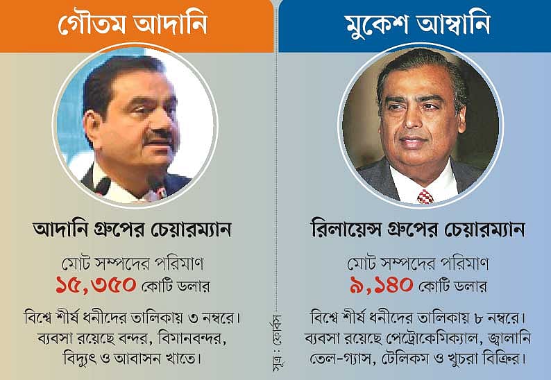 আদানি ও আম্বানি—দুজনই জ্বালানি খাতে নতুন করে সাত হাজার কোটি ডলারের বেশি বিনিয়োগের ঘোষণা দিয়েছেন। ব্যাটারি, হাইড্রোজেন ও সৌরবিদ্যুতের মতো প্রকল্পে এই বিনিয়োগ করবেন তাঁরা।