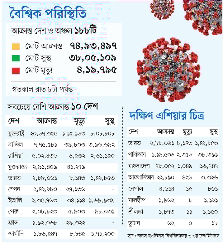 করোনা মহামারি এখন যে অঞ্চলগুলোতে প্রকোপ আকার ধারণ করেছে তার মধ্যে অন্যতম দক্ষিণ এশিয়া। এই অঞ্চলে গত সাত দিনের ব্যবধানে করোনা রোগী বেড়েছে এক লাখের বেশি। দক্ষিণ এশিয়ার দেশগুলোর সরকারি হিসাব অনুসারে এই এক সপ্তাহে মারা গেছেন তিন হাজার মানুষ।