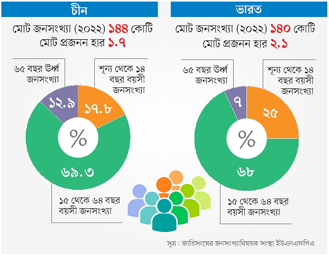 ভারতে প্রজননহার এখন দুইয়ের একটু বেশি। স্বাধীনতার সময় ছিল প্রায় ছয়ের কাছাকাছি। ৩০ বছর আগে ছিল চারের মতো। অর্থাৎ সন্তান জন্মদানে সক্ষম নারীরা এখন তাঁদের মায়েদের থেকে অনেক কম বাচ্চা নিচ্ছে। কিন্তু ইতিমধ্যে দেশটি জনসংখ্যায় বিশ্বের সর্বোচ্চ আসন পাওয়ার পথে। অনুমান হচ্ছে, এপ্রিলে সে রকম ঘোষণা আসবে। তবে উন্নয়নশীল বিশ্বে পরিবার পরিকল্পনা কর্মসূচির অন্যতম আদি পরীক্ষাগার ভারত। মহাত্মা গান্ধী যদিও গর্ভনিরোধকসামগ্রী ব্যবহারের বিপক্ষে ছিলেন, কিন্তু স্বাধীনতার কিছুকাল পর ১৯৫২ সালে ভারতে রাষ্ট্রীয় উদ্যোগে এ কর্মসূচি শুরু হয়ে যায়। প্রচুর সম্পদ বিনিয়োগ হয় এতে। ইন্দিরা গান্ধীর শাসনামলে জরুরি অবস্থার সময় (১৯৭৫-৭৭) এ নিয়ে কিছু জবরদস্তি হয়। গরিবরা তার প্রধান লক্ষ্যবস্তু হয়ে পড়ে। পুলিশি লাঠির নিচে অনেক অবিবাহিতও বন্ধ্যাকরণ কর্মসূচির শিকার হয়। এভাবে ইন্দিরার ‘গরিবি হটাও’ স্লোগান ‘গরিব হটাও’য়ে পরিণত হয়েছিল। এরপর আসে ‘হাম দো, হামারে দো’ (আমরা দুজন, আমাদের দুজন) প্রচার। ইতিমধ্যে শিক্ষা ও স্বাস্থ্যসেবার বিকাশের সঙ্গে তাল মিলিয়ে নারীপ্রতি সন্তানসংখ্যা বেশ কমেছে দেশটিতে। তবে গণচীনে প্রজনন অনেক বেশি হারে কমতে থাকায় জনমিতিতে বৈশ্বিক প্রথম স্থান ভারতের জন্য নির্দিষ্ট হয়ে যায়। গত ৬০ বছরে ২০২২ সালে প্রথম চীনে জন্মসংখ্যা মৃত্যুসংখ্যার চেয়ে কম দেখা গেল। প্রতি হাজার মানুষের বিপরীতে সেখানে মৃত্যু ৭ দশমিক ৩৭ জন; জন্ম ৬ দশমিক ৭৭ জন। এক বছরে প্রায় সাড়ে আট লাখ জনসংখ্যা কমেছে। মাও সেতুংয়ের আমলে দুর্ভিক্ষে কেবল এ রকম ঘটে।