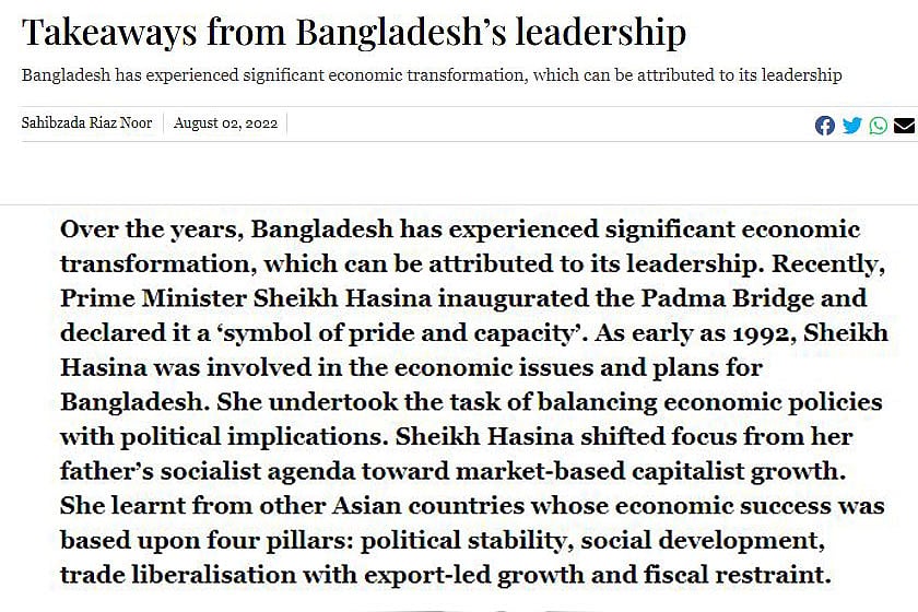 নিবন্ধটি লিখেছেন পাকিস্তানের সাবেক সরকারি কর্মকর্তা ও কলাম লেখক সাহিবজাদা রিয়াজ নূর। ‘বাংলাদেশের নেতৃত্বের কাছ থেকে গ্রহণীয়’ শিরোনামের ওই নিবন্ধে তিনি লিখেছেন, গত কয়েক বছর ধরেই বাংলাদেশ উল্লেখযোগ্য অর্থনৈতিক পরিবর্তনের অভিজ্ঞতা অর্জন করেছে, যার কৃতিত্ব দেশটির নেতৃত্বকে দেওয়া যেতে পারে।