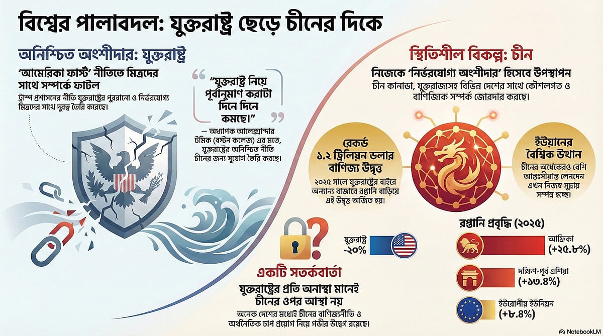 বিশ্লেষকদের মতে, ট্রাম্প প্রশাসনের নীতির কারণে নিজেদের পুরোনো মিত্রদের সঙ্গে যুক্তরাষ্ট্রের সম্পর্ক দুর্বল হয়ে পড়েছে। কিন্তু কানাডা ও ভারতের মতো গুরুত্বপূর্ণ অংশীদারদের সঙ্গে সম্পর্ক জোরদারের দিকে মনোযোগ দিয়েছে চীন। ফলে ২০২৫ সালে বিশ্বের দ্বিতীয় বৃহত্তম অর্থনীতিটির বাণিজ্য উদ্বৃত্ত দাঁড়িয়েছে রেকর্ড ১ লাখ ২০ হাজার কোটি ডলার।
