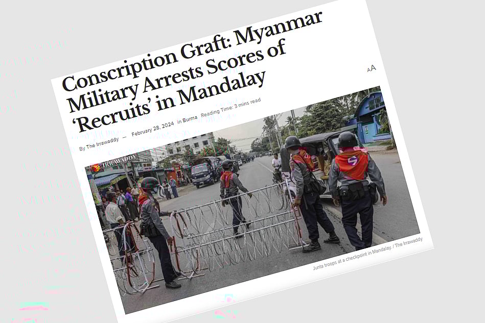 তরুণ–তরুণীদের সেনাবাহিনীতে যোগদান বাধ্যতামূলক–সংক্রান্ত আইন কার্যকরের পর ধরপাকড় শুরু করেছে মিয়ানমারের জান্তা সরকার। চলতি মাসের দ্বিতীয় সপ্তাহে শুধু মান্দালয়ের ছয় শহরে অন্তত ৮০ তরুণ–তরুণীকে গ্রেপ্তার করার খবর জানা গেছে। এই সংখ্যা বেশিও হতে পারে।