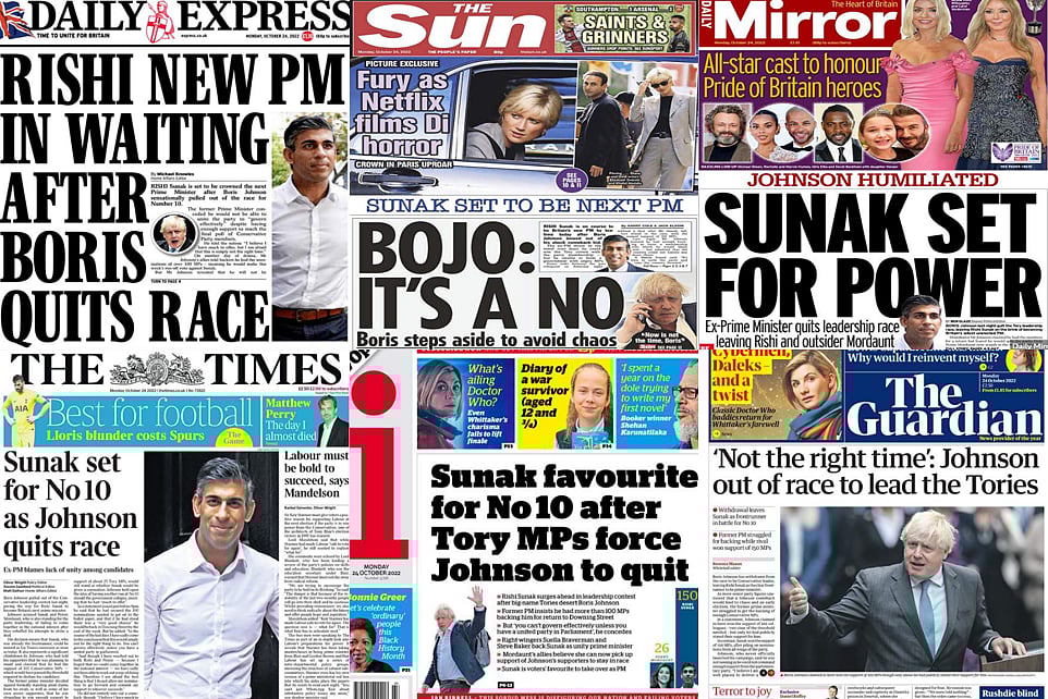 যুক্তরাজ্যের পত্রিকাগুলোও ঋষি সুনাকের সম্ভাবনার কথা উল্লেখ করে শিরোনাম ও খবর প্রকাশ করেছে প্রথম পাতায় করেছে। দ্য টাইমসের খবরে বলা হয়েছে, বরিস জনসন নিজেকে প্রত্যাহার করে নেওয়ায় প্রধানমন্ত্রী হওয়ার পথ পরিষ্কার হলো ঋষি সুনাকের জন্য। প্রথম পাতায় ঋষি সুনাকের বড় ছবিও ছেপেছে পত্রিকাটি।