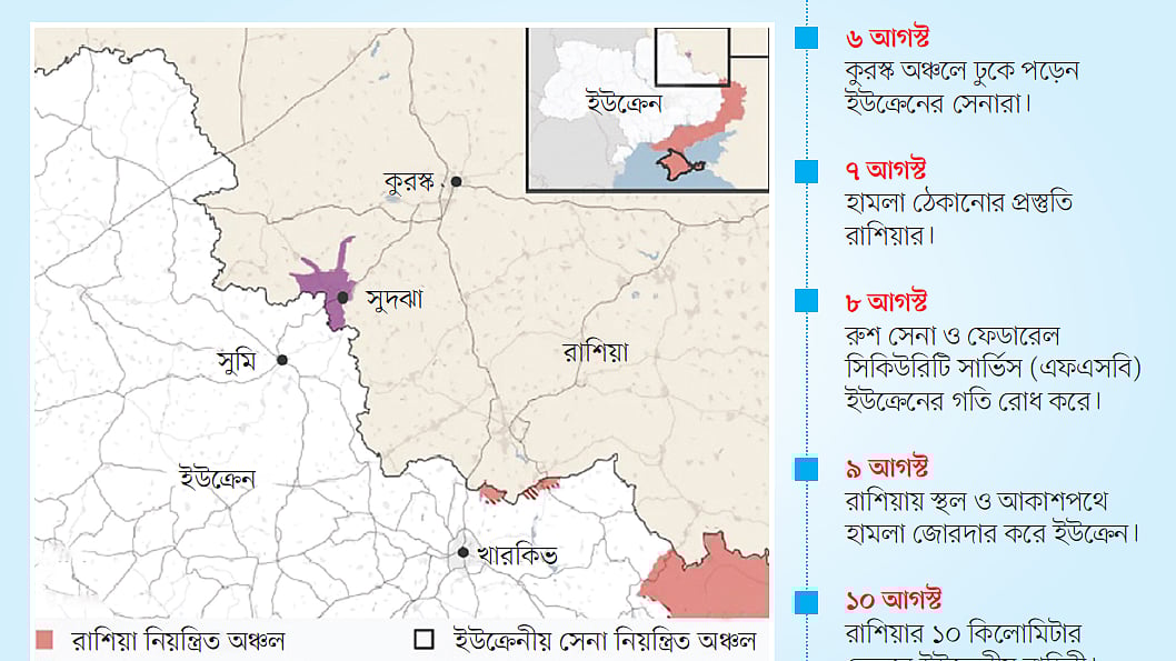 রাশিয়ার ভূখণ্ডে ঢুকে ইউক্রেনীয় বাহিনীর নজিরবিহীন হামলা গতকাল শনিবার পঞ্চম দিনে গড়িয়েছে। ইতিমধ্যে ইউক্রেনীয় সেনারা রাশিয়ার ভেতর ১০ কিলোমিটার অগ্রসর হয়েছেন বলে জানা যাচ্ছে।
