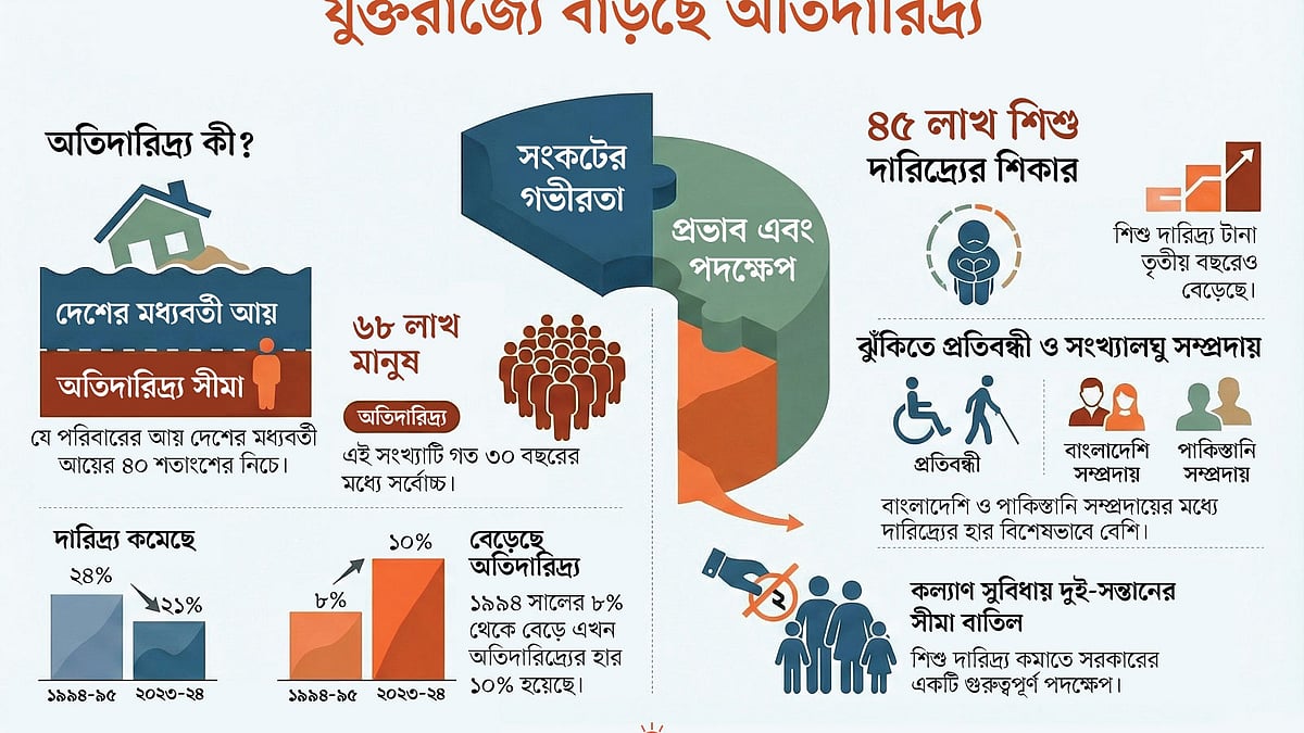 যুক্তরাজ্যে দরিদ্রতা অবসানের লক্ষ্য নিয়ে গবেষণা করে জোসেফ রাউনট্রি ফাউন্ডেশন (জেআরএফ)। তাদের গবেষণা প্রতিবেদন অনুযায়ী যুক্তরাজ্যে মোট দারিদ্র্যের হার ১৯৯৪–৯৫ সালে ২৪ শতাংশ থেকে সামান্য কমে ২০২৩–২৪ সালে ২১ শতাংশ হয়েছে। তবে ‘অতিদারিদ্র্য’ মানুষের সংখ্যা ৮ শতাংশ থেকে বেড়ে ১০ শতাংশ হয়েছে। এর অর্থ, বর্তমানে দেশটিতে দরিদ্র মানুষের মধ্যে প্রায় অর্ধেকই ‘অতিদরিদ্র’।