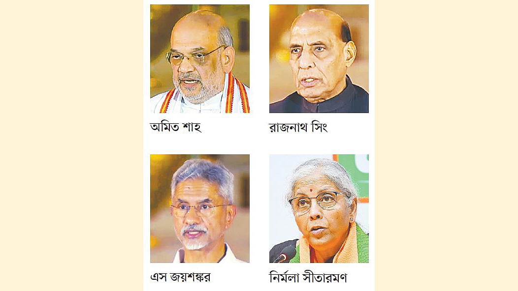 ভারতের কেন্দ্রীয় মন্ত্রিসভার প্রধান চার মন্ত্রণালয়ই বিজেপির হাতে থাকছে। শুধু তা–ই নয়, ওই চার গুরুত্বপূর্ণ দপ্তরের মন্ত্রীরাও একই থাকছেন। অর্থাৎ প্রতিরক্ষা মন্ত্রণালয়ের দায়িত্বে থাকছেন রাজনাথ সিং, অর্থ মন্ত্রণালয়ে নির্মলা সীতারমণ, পররাষ্ট্রে এস জয়শঙ্কর এবং স্বরাষ্ট্রে অমিত শাহ।