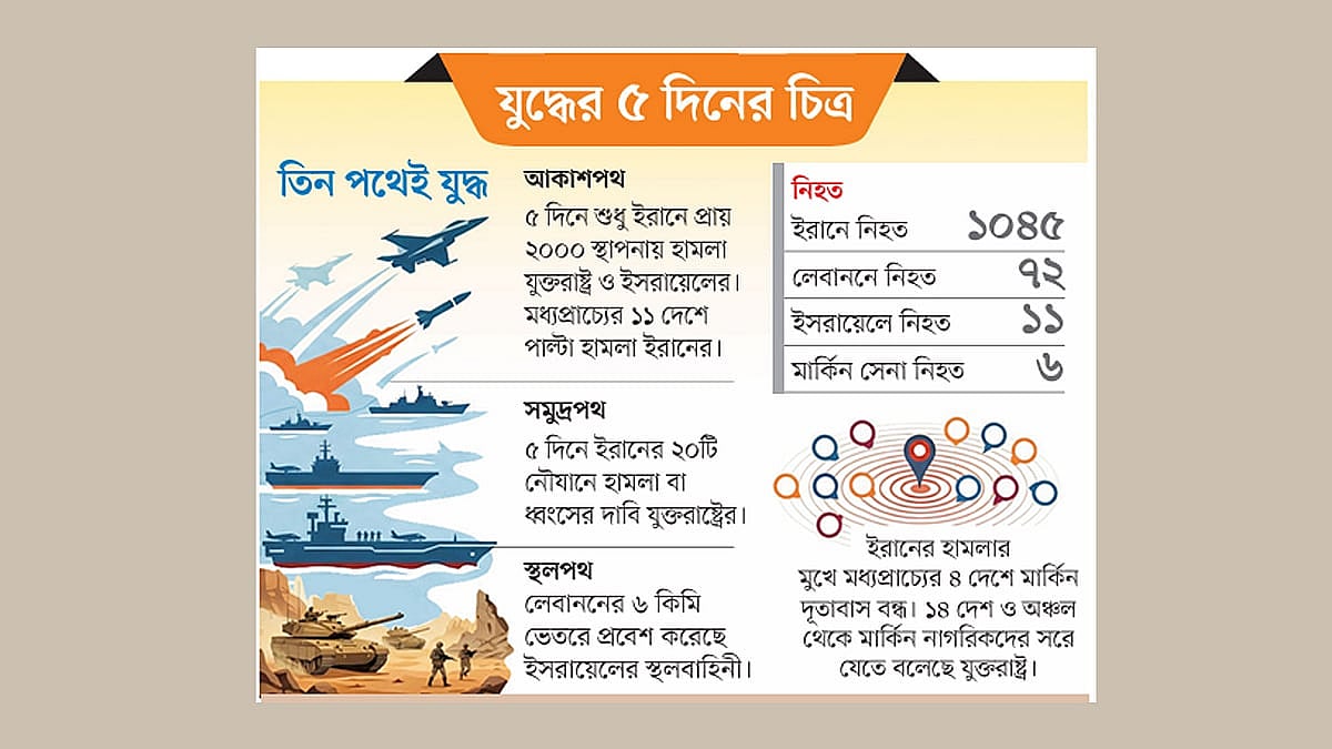 মধ্যপ্রাচ্যে চলমান যুদ্ধের তীব্রতা আরও বেড়েছে। গতকাল বুধবার যুদ্ধের পঞ্চম দিনে ইরান ও লেবাননে হামলা জোরদার করেছে যুক্তরাষ্ট্র ও ইসরায়েল। ইরানে নিহতের সংখ্যা হাজার ছাড়িয়েছে। পাল্টায় আশপাশের যুক্তরাষ্ট্রের মিত্রদেশগুলোতে ক্ষেপণাস্ত্র ও ড্রোন হামলা চালিয়েছে ইরান। এর মধ্যে মধ্যপ্রাচ্যে যুক্তরাষ্ট্রের সবচেয়ে বড় সামরিক স্থাপনা কাতারের আল-উদেইদ ঘাঁটিতে আঘাত হেনেছে ইরানের ব্যালিস্টিক ক্ষেপণাস্ত্র। আর দুবাইয়ে মার্কিন কনস্যুলেটে বিস্ফোরিত হয়েছে ইরানের ড্রোন।