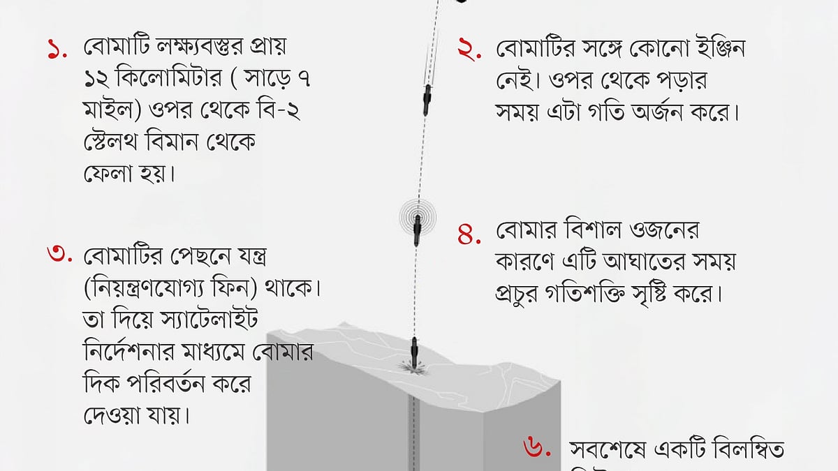 জিবিইউ-৫৭ বাংকার বাস্টার নামে যুক্তরাষ্ট্রের তৈরি বোমাটি ম্যাসিভ অর্ডন্যান্স পেনিট্রেটর (এমওপি) নামে পরিচিত। এতে ১২ টনের বেশি বিস্ফোরক থাকে।