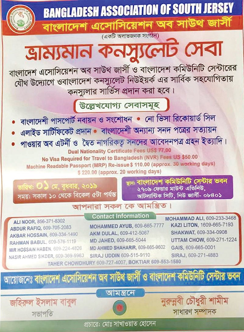 বাংলাদেশ অ্যাসোসিয়েশন অব সাউথ জার্সি ও বাংলাদেশ কমিউনিটি সেন্টারের যৌথ উদ্যোগে আটলান্টিক সিটির ২৭০৯, ফেয়ারমাউন্ট অ্যাভিনিউর বাংলাদেশ কমিউনিটি সেন্টারে নিউইয়র্কে অবস্থিত বাংলাদেশ কনস্যুলেটের সহযোগিতায় এই ভ্রাম্যমাণ কনস্যুলেট সেবা প্রদান করা হবে।