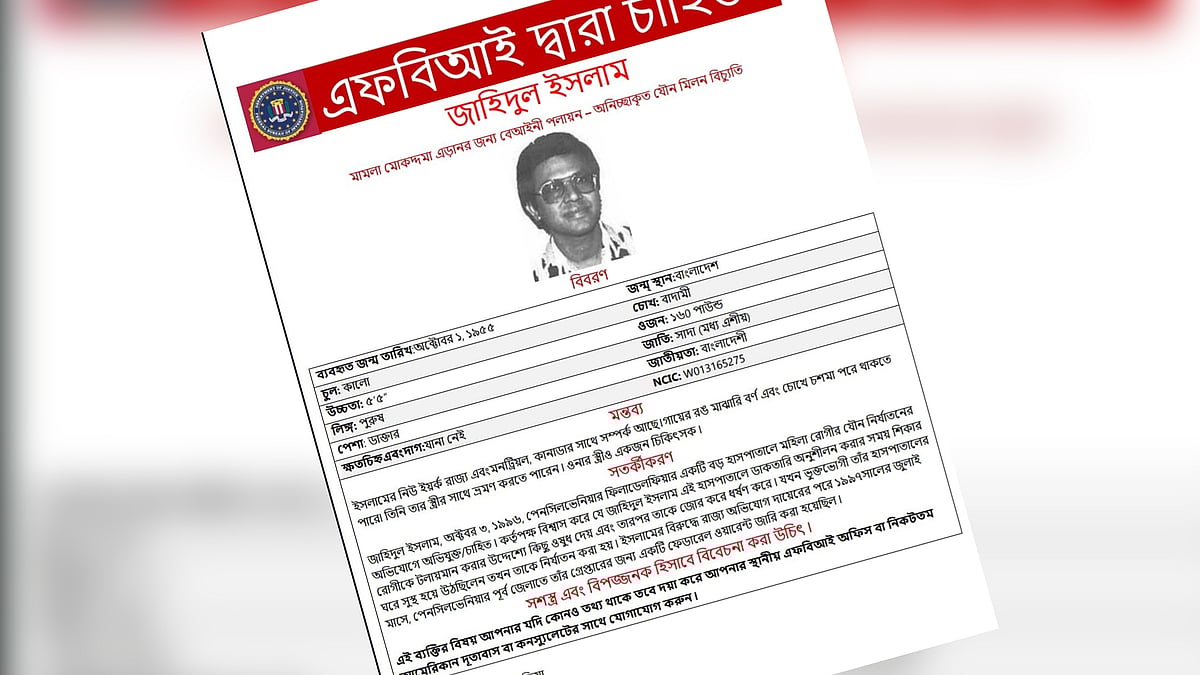 যুক্তরাষ্ট্রের পেনসিলভানিয়া অঙ্গরাজ্যের বাংলাদেশি বংশোদ্ভূত চিকিৎসক জাহিদুল ইসলামের বিরুদ্ধে ২৯ বছর আগে যৌন নির্যাতনের অভিযোগ ওঠে। ওই ঘটনায় তাঁর বিরুদ্ধে মামলা হয়। বিচার এড়াতে পালানোর চেষ্টা করায় তাঁর বিরুদ্ধে গ্রেপ্তারি পরোয়ানা জারি করেছিলেন ফিলাডেলফিয়ার ফেডারেল আদালত।
