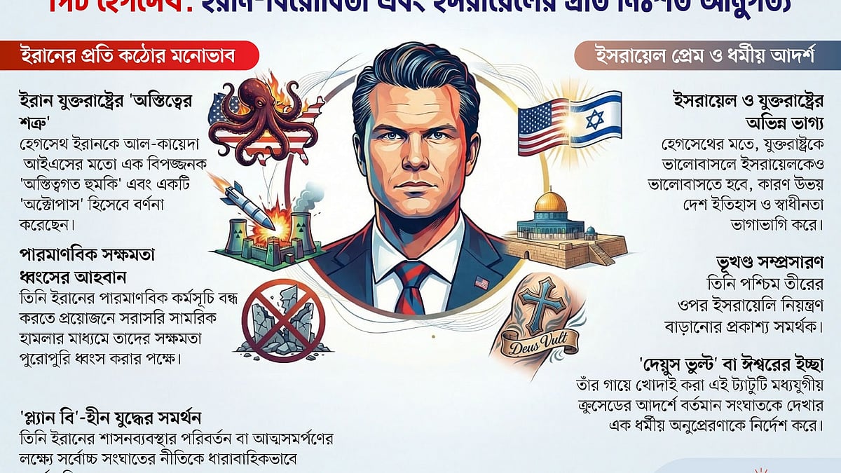 এসব মন্তব্য ইরানের বিরুদ্ধে চলমান যুদ্ধে পিট হেগসেথের ব্যক্তিগত দৃষ্টিভঙ্গির ওপর নতুন করে আলোকপাত করছে। তিনি ইরানকে যুক্তরাষ্ট্রের প্রধান শত্রু হিসেবে উপস্থাপন করছেন এবং ইসলামি প্রজাতন্ত্রের সঙ্গে সর্বোচ্চ সংঘাতের পক্ষে ধারাবাহিকভাবে সমর্থন দিয়ে আসছেন।