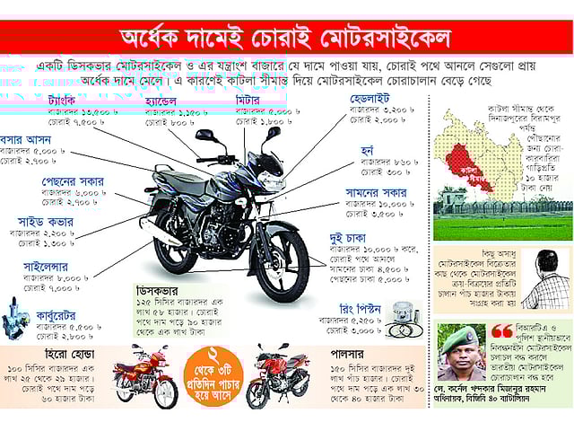 গত মে মাসের বিভিন্ন সময় কাটলা সীমান্তে অনুসন্ধান চালিয়ে জানা গেছে, চোরাই পথে বাজাজ কোম্পানির পালসার ও ডিসকভার এবং হিরো হোন্ডা—এই দুই ব্র্যান্ডের তিন মডেলের মোটরসাইকেল দেশে আসছে।