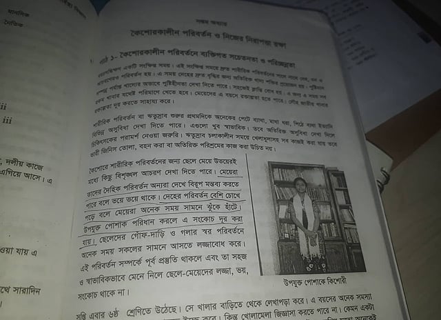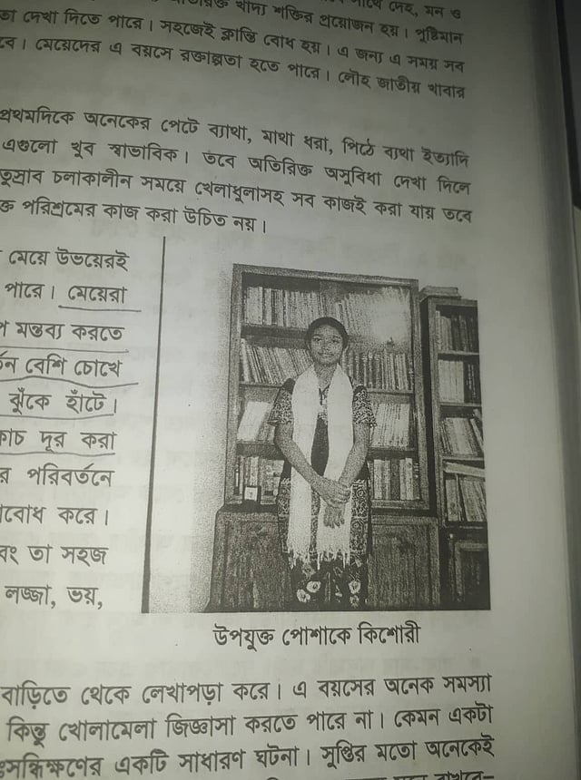 সাদা-কালো সালোয়ার-কামিজ আর সাদা ওড়না গায়ে এক কিশোরীর ছবি। ছবির নিচে লেখা, ‘উপযুক্ত পোশাকে কিশোরী’। এই ছবির পাশেই লেখা, ‘মেয়েরা তাদের দৈহিক পরিবর্তন অন্যরা দেখে বিরূপ মন্তব্য করতে পারে বলে ভয়ে ভয়ে থাকে। দেহের পরিবর্তন বেশি চোখে পড়ে বলে মেয়েরা অনেক সময় সামনে ঝুঁকে হাঁটে। উপযুক্ত পোশাক পরিধান করলে এ সংকোচ দূর করা যায়।’