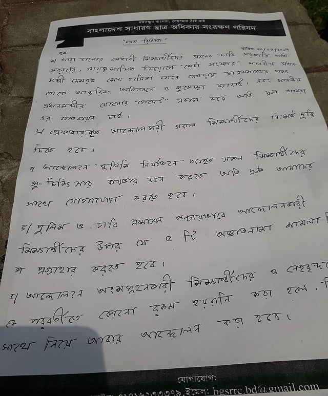 এরপর কমিটির ৩ নম্বর যুগ্ম আহ্বায়ক নুরুল হক কয়েকটি দাবি পড়ে শোনান। এর মধ্যে আছে প্রধানমন্ত্রীর ঘোষণা ‘গেজেট’ আকারে প্রকাশ করে এর দ্রুত বাস্তবায়ন, গ্রেপ্তার হওয়া আন্দোলনকারীদের নিঃশর্ত মুক্তি, আন্দোলনে ‘পুলিশি নির্যাতনে’ আহত শিক্ষার্থীদের চিকিৎসার ব্যয়ভার বহন, পুলিশ ও ঢাকা বিশ্ববিদ্যালয় প্রশাসনের ৫টি মামলা প্রত্যাহার। এ ঘোষণায় বলা হয়, আন্দোলনে অংশগ্রহণকারী শিক্ষার্থীদের ও নেতাদের পরবর্তী সময়ে কোনো রকম হয়রানি করা হলে আবার আন্দোলন করা হবে।
