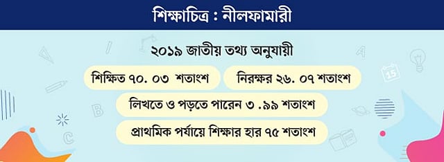 নীলফামারী জেলায় ২০১৯ জাতীয় তথ্য অনুযায়ী মোট শিক্ষার হার ৭০ দশমিক ০৩ শতাংশ। নিরক্ষরের হার ২৬.০৭ শতাংশ। জেলার লিখতে ও পড়তে পারা মানুষের সংখ্যা প্রায় ৪ শতাংশ।