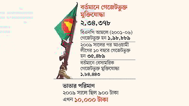 নতুন সরকার এলেই মুক্তিযোদ্ধাদের তালিকা বড় হয়। ৪৭ বছরে ছয়বার মুক্তিযোদ্ধা তালিকা সংযোজন-বিয়োজন হয়েছে। মুক্তিযোদ্ধার বয়স, সংজ্ঞা ও মানদণ্ড পাল্টেছে ১১ বার। আওয়ামী লীগ সরকার ঢাকঢোল পিটিয়ে তালিকা যাচাই-বাছাই শুরু করলেও ব্যাপক অনিয়মের অভিযোগে তা থেমে যায়। কিন্তু এ কাজে খরচ হয়ে গেছে চার কোটি টাকা। এবার ২৬ মার্চ আরেকটি মুক্তিযোদ্ধা তালিকা প্রকাশ করার সিদ্ধান্ত নিয়েছে সরকার। অবশ্য এই তালিকাও অপূর্ণাঙ্গ।
