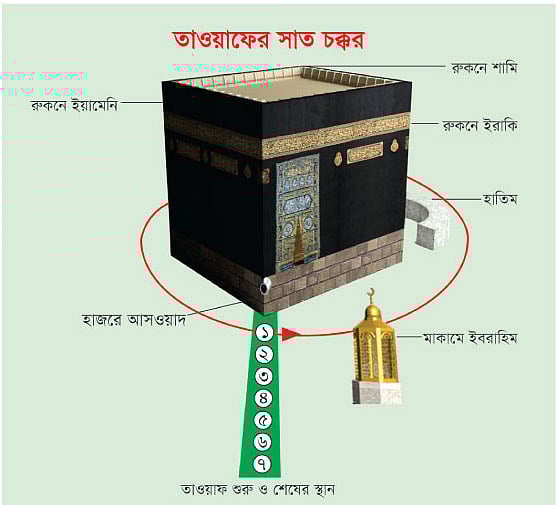 - কাবা ঘরের চারটি কোণের আলাদা নাম আছে: হাজরে আসওয়াদ, রুকনে ইরাকি, রুকনে শামি ও রুকনে ইয়ামেনি। হাজরে আসওয়াদ বরাবর কোণ থেকে শুরু হয়ে কাবাঘরের পরবর্তী কোণ রুকনে ইরাকি (দুই কোণের মাঝামাঝি স্থান মিজাবে রহমত ও হাতিম)। তারপর যথাক্রমে রুকনে শামি ও রুকনে ইয়ামেনি। এটা ঘুরে আবার হাজরে আসওয়াদ বরাবর এলে তাওয়াফের এক চক্কর পূর্ণ হয়। এভাবে একে একে সাত চক্কর দিতে হয়।