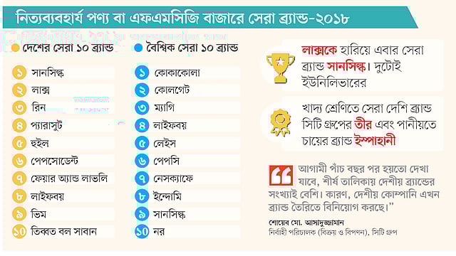 এবার বাংলাদেশে এফএমসিজির শীর্ষস্থানীয় ৫০টি ব্র্যান্ডের তালিকায় স্থান পেয়েছে ২৫টি দেশীয় ব্র্যান্ড। বাকি ২৫টি এ দেশে কর্মরত বিদেশি ও আমদানি পণ্যের ব্র্যান্ড। তবে এফএমসিজির উপখাত খাদ্য ও পানীয় শ্রেণিতে শীর্ষস্থান পেয়েছে দুটি বাংলাদেশি ব্র্যান্ড। এর মধ্যে একটি খাদ্যশ্রেণিতে সিটি গ্রুপের তীর এবং অন্যটি পানীয় শ্রেণিতে চায়ের ব্র্যান্ড ইস্পাহানী। খাদ্য, পানীয়, প্রসাধন, গৃহ পরিচর্যা ও দুধ মিলিয়ে এফএমসিজির বাজার।