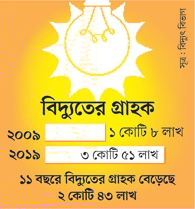 বিদ্যুৎ বিভাগের তথ্য অনুযায়ী, ২০০৯ সালে সারা দেশে বিদ্যুতের গ্রাহক ছিল ১ কোটি ৮ লাখ। গত ১১ বছরে গ্রাহক বেড়ে দাঁড়িয়েছে ৩ কোটি ৫১ লাখ। এই সময়ে জাতীয় সঞ্চালন লাইনের বাইরে থাকা প্রত্যন্ত গ্রাম ও চরাঞ্চলেও বিদ্যুৎ সরবরাহ করেছে সরকার। এতে মাথাপিছু বিদ্যুতের ব্যবহারও বেড়েছে। আগে উৎপাদন অনুযায়ী বছরে মাথাপিছু বিদ্যুৎ ব্যবহার ছিল ২২০ ইউনিট (কিলোওয়াট প্রতি ঘণ্টা)। বর্তমানে সেটি বেড়ে দাঁড়িয়েছে ৫১০ ইউনিটে।