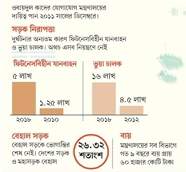 ২০০৯ সালে সরকার ঘোষণা দিল, ফিটনেসবিহীন গাড়ি আর চলবে না। রাজধানী থেকে ২০ বছরের পুরোনো সব বাস তুলে দেওয়া হবে। দুই বছর পর ওবায়দুল কাদের মন্ত্রীর দায়িত্ব পেলেন। সড়ক পরিবহন উপদেষ্টা পরিষদের সভাপতির দায়িত্বও তাঁর কাঁধে। এর পরের বছর (২০১২) এই পরিষদের সভায় মন্ত্রী ফিটনেসবিহীন যানবাহন তুলে দেওয়ার ঘোষণা দিলেন। পরের বছরের জুনে এই পরিষদের আরেক সভায় একই ঘোষণা দেন তিনি। ঘোষণা দিতে দিতেই সরকারের মেয়াদ শেষ।