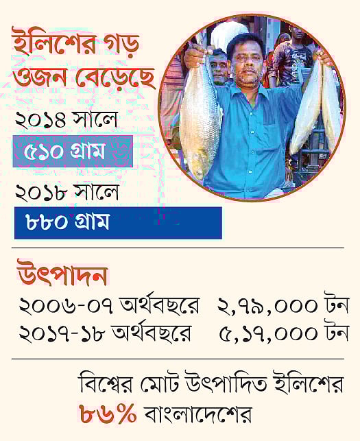 >• তিন বছরে দেশের ইলিশের আকৃতি ও ওজন বেড়েছে