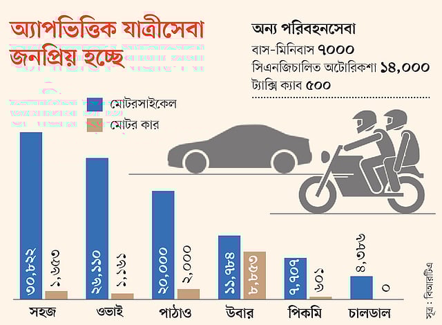 রাজধানী ঢাকায় অ্যাপের মাধ্যমে যাত্রী পরিবহন (রাইড শেয়ারিং) করছে প্রায় সোয়া লাখ মোটরসাইকেল ও কার। এতে নগরবাসী সুবিধাও পাচ্ছে। কিন্তু এই সেবা এখনো আইনি ভিত্তি পায়নি, এক বছর আগের নীতিমালা কাগজে-কলমেই আছে। রাইড শেয়ারিং কোম্পানিগুলো নিজেদের মতো করে সেবা দিচ্ছে।
