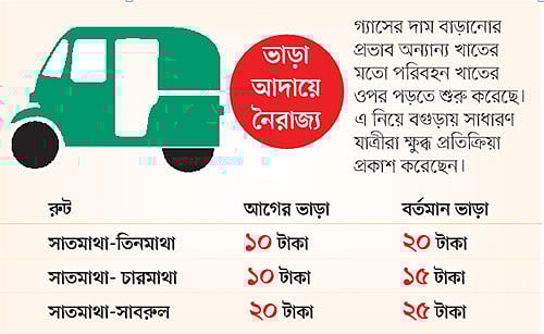 স্থানীয় কয়েকজনের সঙ্গে আলাপ করে জানা গেছে, বগুড়ার সাতমাথা থেকে তিনমাথা পর্যন্ত তিন কিলোমিটার সড়ক। কয়েক দিন আগে সিএনজিচালিত অটোরিকশায় সাতমাথা থেকে তিনমাথা পর্যন্ত ভাড়া ছিল ৫ টাকা। কিন্তু এখন নেওয়া হচ্ছে ১০ টাকা। প্রতি ঘনমিটার গ্যাসের দাম বেড়েছে ৩ টাকা। এক ঘনমিটার গ্যাসে অটোরিকশা চলে অন্তত ৬ কিলোমিটার। এ হিসাবে ভাড়া এক টাকারও কম হওয়ার কথা।