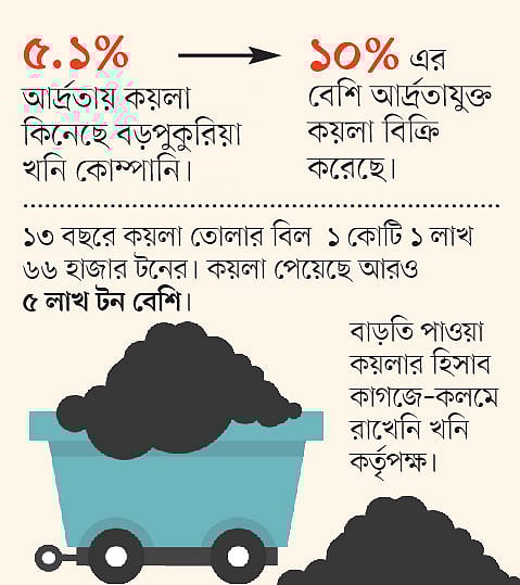 খনি থেকে তোলা কয়লা ভেজা থাকে। সেই কয়লায় পানি বা আর্দ্রতা নির্দিষ্ট পরিমাণের চেয়ে বেশি থাকলে তার মূল্য দেওয়া হয় না। চীনা কনসোর্টিয়ামের সঙ্গে চুক্তি অনুযায়ী ৫ দশমিক ১ শতাংশ পানিসহ (আর্দ্রতা) কয়লা কিনেছে বিসিএমসিএল। কিন্তু খনির পাশে অবস্থিত বড়পুকুরিয়া বিদ্যুৎকেন্দ্রে ও খোলাবাজারে ১০ শতাংশের বেশি আর্দ্রতাযুক্ত কয়লা বিক্রি করেছে বিসিএমসিএল। এই অবস্থায় ৫ শতাংশ আর্দ্রতা বাড়ায় ১ কোটি ১ লাখ ৬৬ হাজার টন কয়লার বাড়তি হয়েছে আরও পাঁচ লাখ টনের বেশি। এই বাড়তি পাঁচ লাখ টন কয়লার দাম প্রায় ৮৪৬ কোটি টাকা (খোলাবাজারে প্রতি টন কয়লার দাম ১৬ হাজার ৯২৭ টাকা)। এই টাকা খনি কোম্পানির তহবিলে যাওয়ার কথা। কিন্তু সেটার কোনো হিসাব পাওয়া যাচ্ছে না।