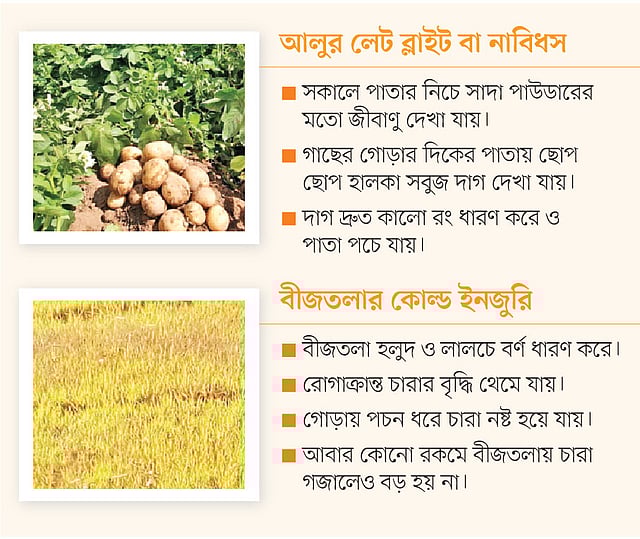 ঠাকুরগাঁওয়ে টানা শীত ও কুয়াশার কারণে আলুগাছে ছত্রাকজনিত নাবিধসা (লেট ব্লাইট) রোগ দেখা দিয়েছে। একই কারণে লালমনিরহাটের পাটগ্রাম উপজেলায় বোরো ধানের বীজতলা নষ্ট হওয়ার আশঙ্কা দেখা দিয়েছে। এতে কৃষক বিপাকে পড়েছেন।