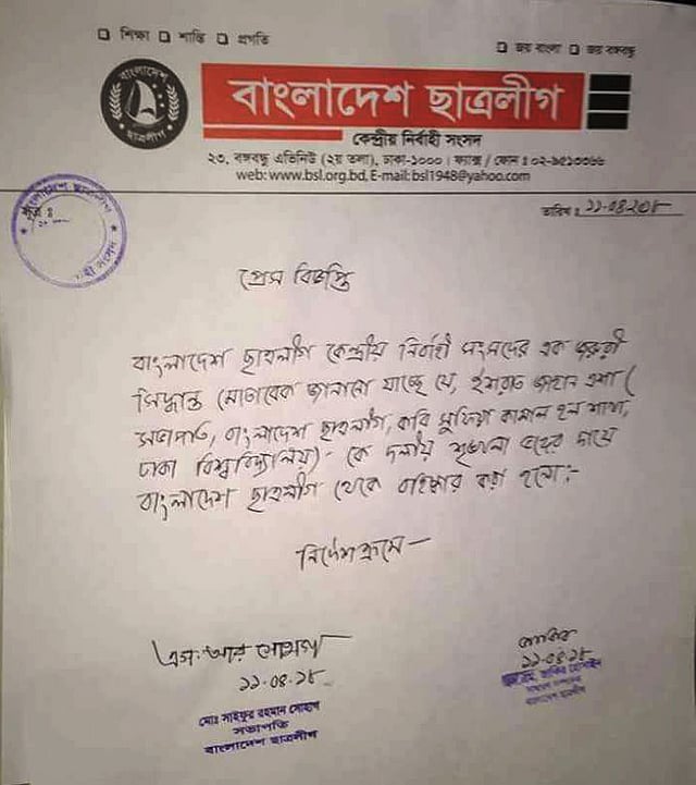 ঘটনার পরপরই ছাত্রলীগের কেন্দ্রীয় কমিটির সভাপতি সাইফুর রহমান ও সাধারণ সম্পাদক এস এম জাকির হোসাইন স্বাক্ষরিত এক সংবাদ বিজ্ঞপ্তিতে ইফফাতকে সংগঠন থেকে বহিষ্কারের ঘোষণা দেওয়া হয়।