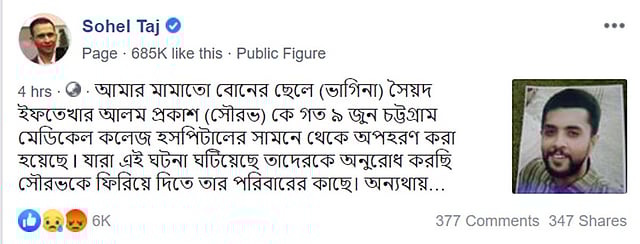 সোহেল তাজ বলেন, ‘পরিবারের ব্যাকগ্রাউন্ড কী সেটা মূখ্য বিষয় নয়। রাষ্ট্র চলবে আইনের শাসনের মাধ্যমে। আশা করব সব মানুষের জন্য এটি সমানভাবে প্রযোজ্য হবে। সে অনুযায়ী আমার ভাগনেকে জীবিত ও সুস্থ অবস্থায় দ্রুত ফিরে পাব রাষ্ট্র ও আইনশৃঙ্খলা রক্ষাকারী বাহিনীর কাছে সেটাই প্রত্যাশা থাকবে।’