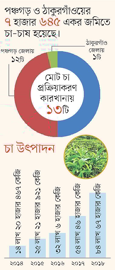 বাংলাদেশ চা বোর্ড পঞ্চগড় আঞ্চলিক কার্যালয় সূত্রে জানা যায়, পঞ্চগড় জেলায় ২০০০ সালে চা–চাষ শুরু হয়। গত এক দশকের হিসাব অনুযায়ী ২০০৯ সালের তুলনায় ২০১৮ সালে চায়ের চাষ সাড়ে ৩ গুণ বেড়েছে। ওই সময়ের চায়ের উৎপাদন বেড়েছে ১৩ গুণ। নর্দান বাংলাদেশ প্রকল্পের আওতায় এখন পর্যন্ত মোট ৭ হাজার ৬৪৫ একর জমিতে চা–চাষ হয়েছে। এর মধ্যে পঞ্চগড় জেলায় জেলায় মোট চা–চাষ হয়েছে ৬ হাজার ৭৯২ একর জমিতে। যার মধ্যে নিবন্ধিত চা–বাগান ৭টি এবং অনিবন্ধিত রয়েছে ১৮টি। নিবন্ধিত ক্ষুদ্র চা–বাগান ১৫টি এবং অনিবন্ধিত ২টি। এ ছাড়া ক্ষুদ্র চা–চাষির সংখ্যা (শূন্য থেকে ৫ একর) নিবন্ধিত ৬১৮ জন এবং অনিবন্ধিত ৩ হাজার ১৯০ জন।