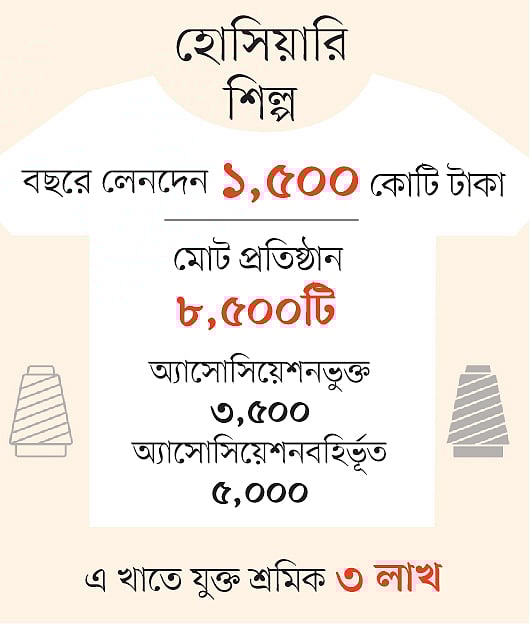 বাংলাদেশ হোসিয়ারি অ্যাসোসিয়েশনের হিসাব অনুযায়ী, এখন তাদের অধিভুক্ত প্রতিষ্ঠান সাড়ে তিন হাজার। এর বাইরে ছোট ছোট আরও পাঁচ হাজারের মতো প্রতিষ্ঠান আছে। মোট প্রায় সাড়ে আট হাজার প্রতিষ্ঠানে যুক্ত আছেন প্রায় তিন লাখ শ্রমিক।