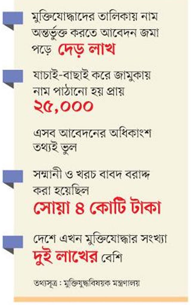 দেশে এখন মুক্তিযোদ্ধার সংখ্যা দুই লাখের বেশি। মুক্তিযোদ্ধাদের তালিকায় নাম অন্তর্ভুক্ত করতে অনলাইনে ও সরাসরি আরও দেড় লাখ আবেদন জমা পড়ে। তাঁদের মধ্যে স্থানীয় পর্যায়ে যাচাই-বাছাই করে প্রায় ২৫ হাজার নাম পাঠানো হয়। মুক্তিযুদ্ধবিষয়ক মন্ত্রণালয় হাজার পাঁচেক ব্যক্তির নাম মুক্তিযোদ্ধার তালিকায় অন্তর্ভুক্ত করতে চেয়েছিল।