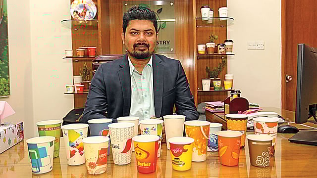 কেপিসি ইন্ডাস্ট্রিজের কারখানায় কাগজ দিয়ে পরিবেশবান্ধব কাপ তৈরির কাজ তদারক করছেন প্রতিষ্ঠানটির স্বত্বাধিকারী কাজী সাজেদুর রহমান। সম্প্রতি রাজধানীর তেজগাঁওয়ে। ছবি: সাজিদ হোসেন