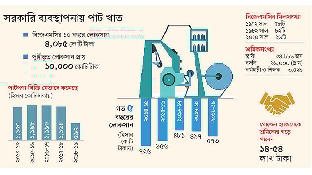 সব মিলিয়ে সরকারি পাট খাতের পুঞ্জীভূত লোকসানের পরিমাণ এখন প্রায় ১০ হাজার কোটি টাকা। লোকসানের বোঝা বইতে না পেরে ২৪ হাজার ৮৮৬ জন স্থায়ী শ্রমিককে স্বেচ্ছা অবসরে (গোল্ডেন হ্যান্ডশেক) পাঠানোর প্রক্রিয়া শুরু করে ১ জুলাই পাটকল বন্ধ করা হয়েছে।