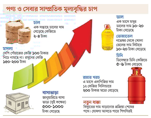 শুধু বাজারেই যে অস্বস্তি, তা নয়। জানুয়ারিতে অনেকের বাসাভাড়া বেড়েছে, দুই শয়নকক্ষের বাসার ক্ষেত্রে বাড়ার পরিমাণ ৫০০ থেকে ১ হাজার টাকা। তরলীকৃত পেট্রোলিয়াম গ্যাসের (এলপিজি) দাম বেড়েছে এক সিলিন্ডারে (১২ কেজি) ২০০ টাকা। এ মাসেই অনেক এলাকায় ডিশ বিল, ময়লা নেওয়ার বিল বাড়িয়েছেন সেবাদাতারা।
